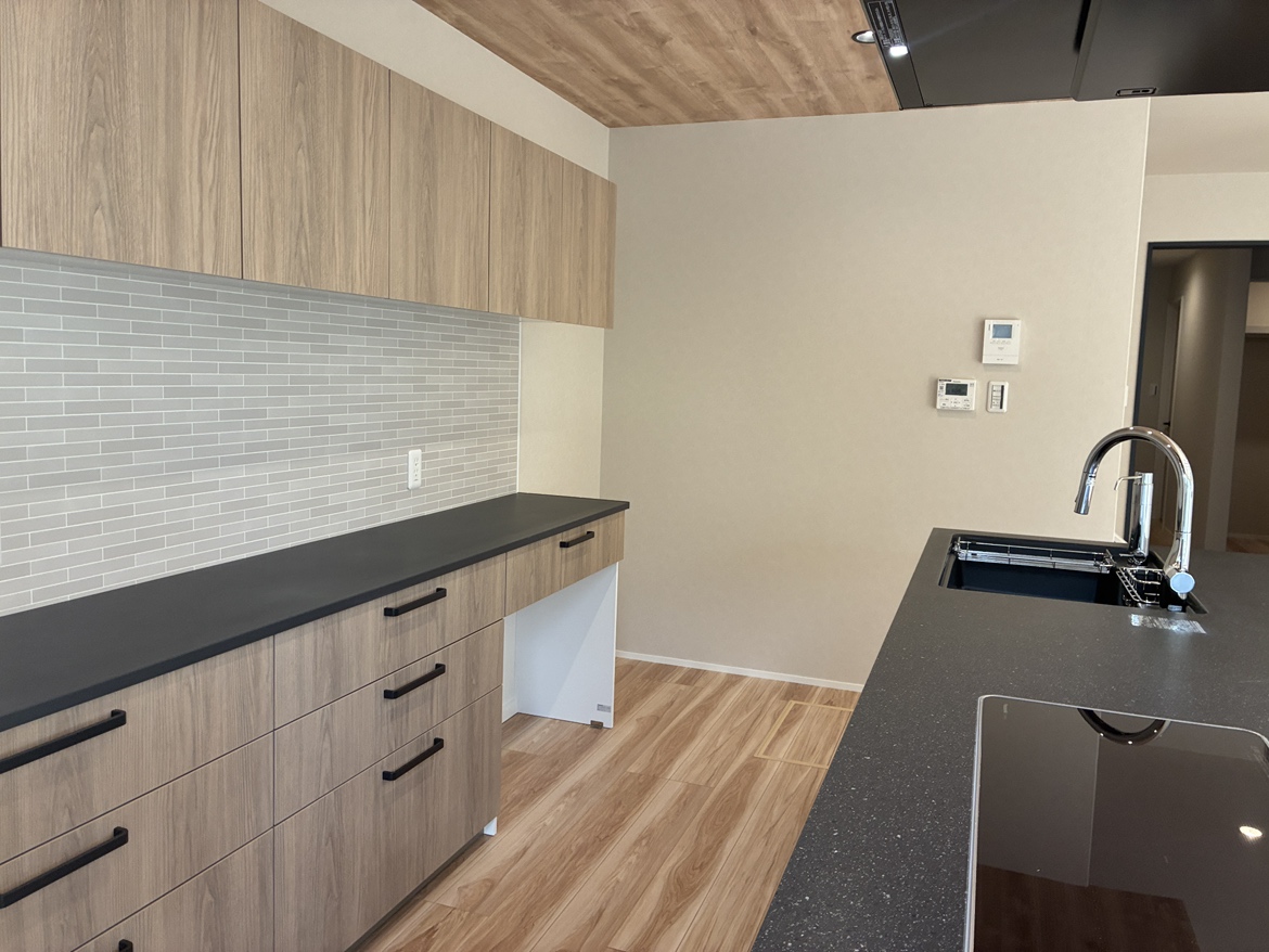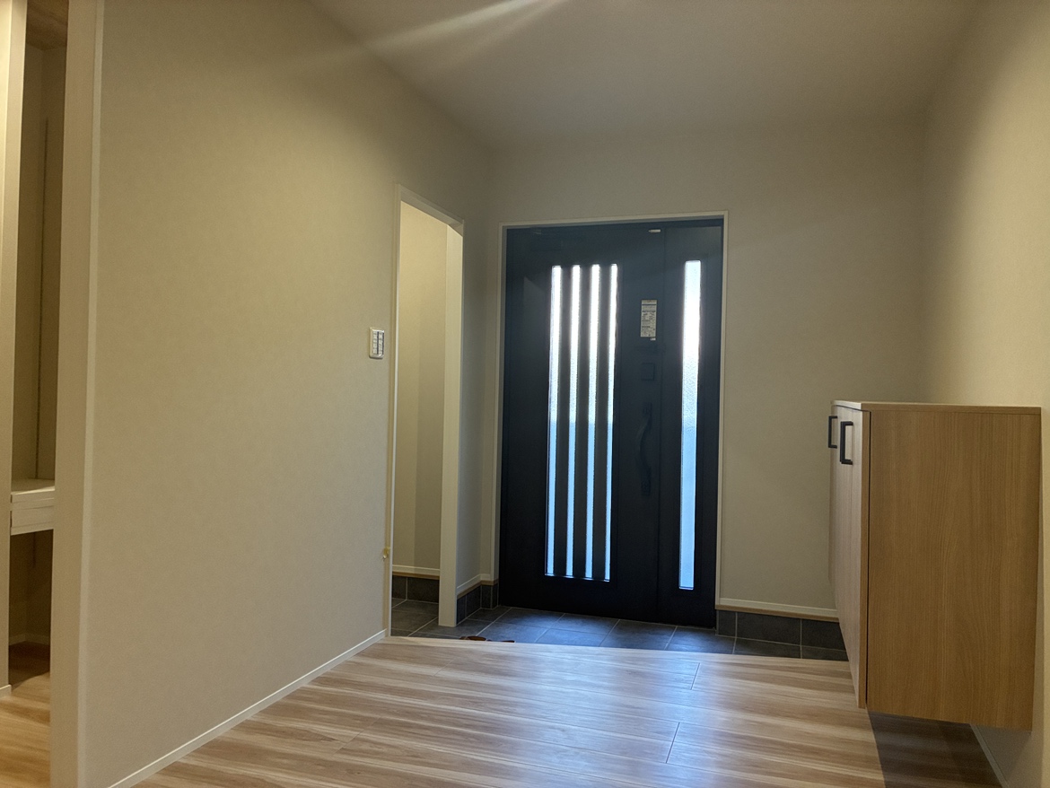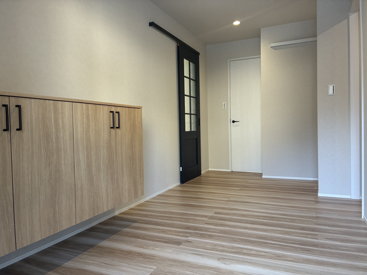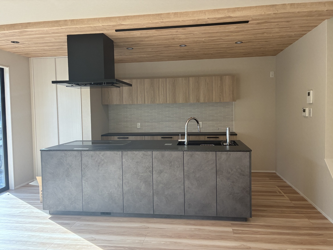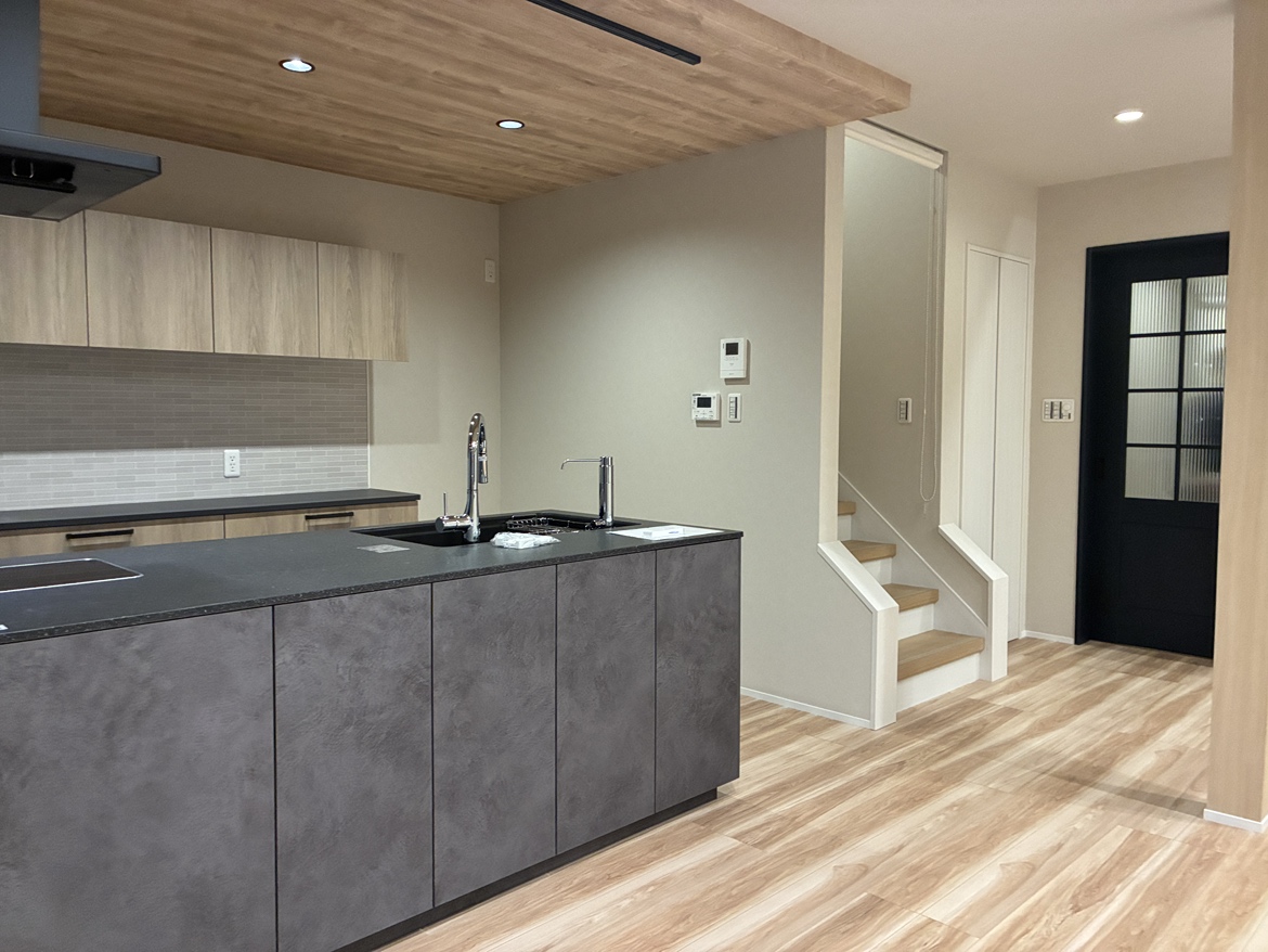 2間つづきの和室・広縁と土間を間取り変更し、家族みんなで集える広いLDKへとリフォーム。キッチンはブラックを基調とし、空間の主役となるアイランドキッチンへと生まれ変わりました。移設した玄関には大容量のシューズクロークを設け、玄関周りの収納不足を解消。(※下記の工期及び費用には外構工事も含みます)